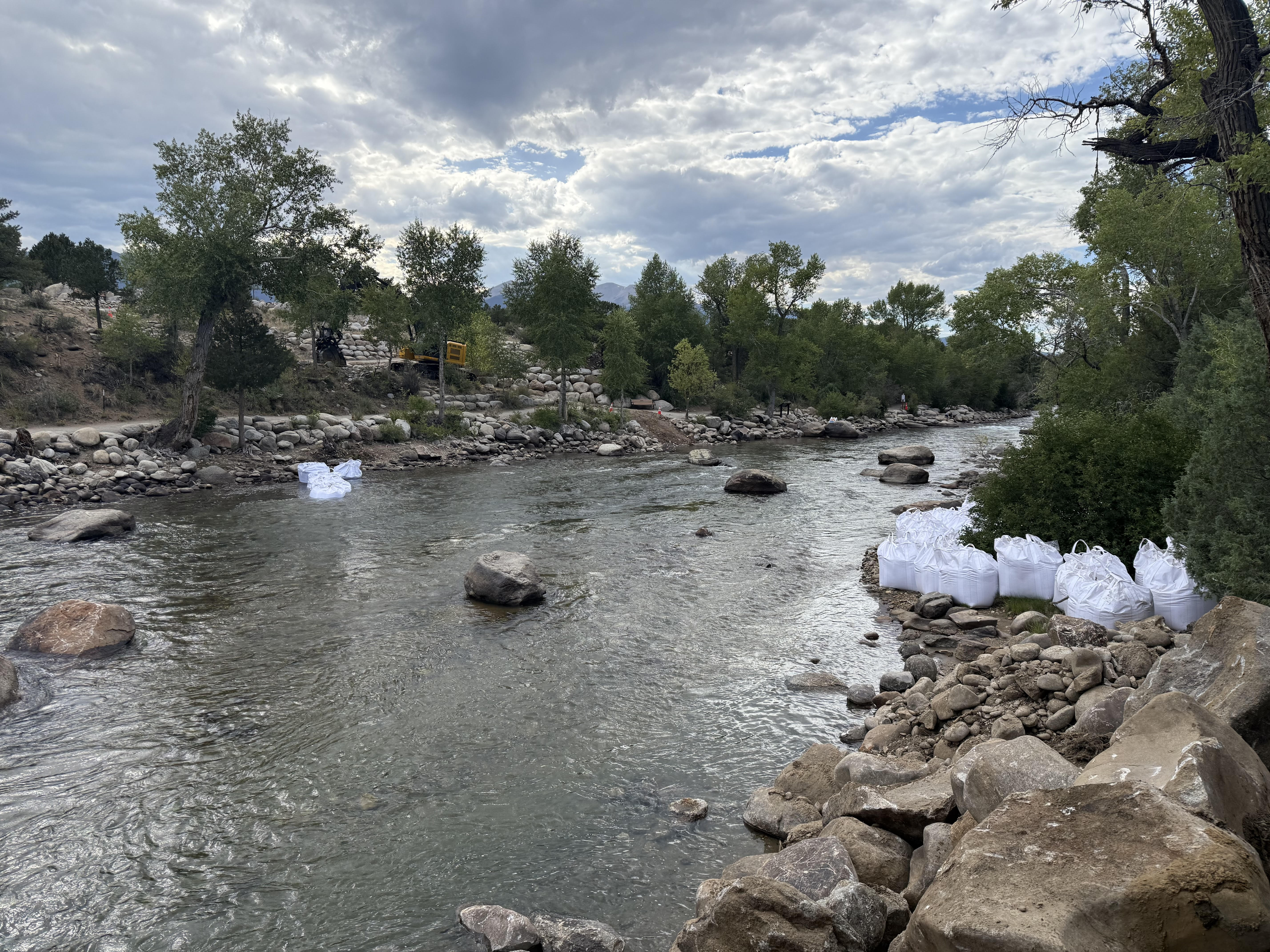 Originally scheduled for 2023, construction has been rescheduled to begin in mid-August 2025, with in-river work starting as early as water levels allow. This shift has allowed the Town of Buena Vista and our partners more time to refine the design based on community feedback and to better serve a wider range of river users.Image Caption: View of the Arkansas River in Buena Vista with construction equipment and large white sandbags staged along the riverbank for the Pocket Wave 2.0 maintenance project. Trees and boulders line the river under a partly cloudy sky.